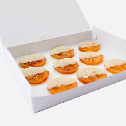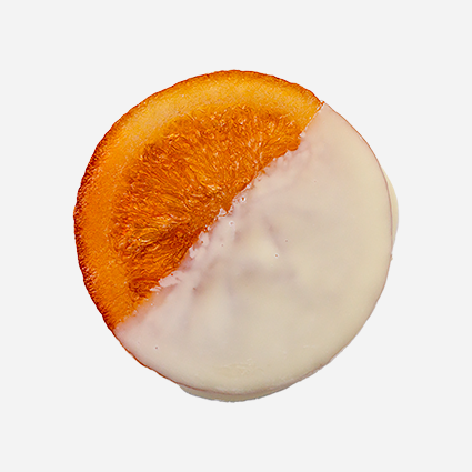 高級素材: フランスAPTUNION社のオレンジスライスにイタリア産ホワイトチョコレートをコーティング。爽やかな風味と洗練された味わいの組み合わせ